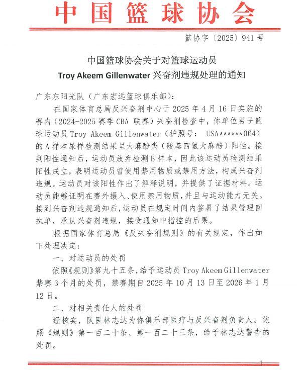 早在六月份的时候,中国反兴奋剂中心公布了CBA球员的兴奋剂违规情况,前广东男篮的外援吉伦沃特在4月16日的赛后检查中,A样本检测呈大麻酚类阳性,且其放弃了检测B样本,构成了兴奋剂违规,这件事引发了众多媒体和球迷的热议。经过了三个月的调查后,中国篮协发布官宣,表示吉伦沃特的事情已经调查清楚,并公布了处罚结果。