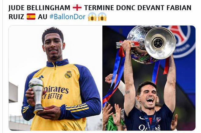 因此,当看到法比安·鲁伊斯的排名甚至落后于贝林厄姆,不少法国媒体和球迷感到难以接受。社交媒体上,有球迷讽刺道:“法比安·鲁伊斯第24,若昂·内维斯第19?哈哈哈……” 言语中充满了对评选结果的质疑与不屑。