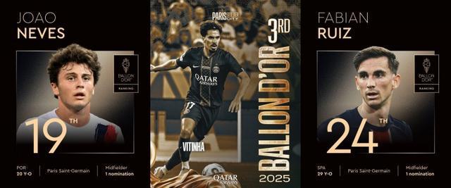 而上赛季为巴黎夺冠立下汗马功劳的中场3人,也都入围提名,维蒂尼亚排名第3、若奥-内维斯排名第19、法比安-路易斯排名第24。组建这条中场却只花费了巴黎1.23亿欧。