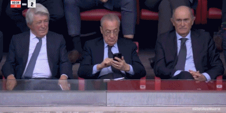 马竞打进第5球,主帅西蒙尼朝着看台疯狂怒吼庆祝。坐在贵宾包厢的皇马主席弗洛伦蒂诺,则面色铁青地看着刷着手机。