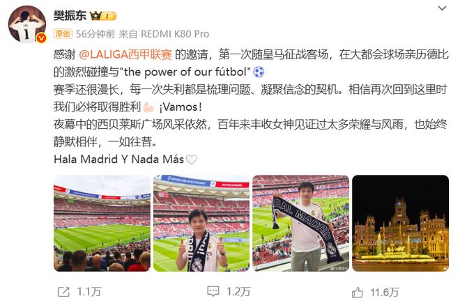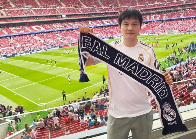 这不是樊振东第一次展示对足球的热爱,但却是他首次以“随队出征”的身份体验客场比赛,他在发文中感慨:“赛季还很漫长,每一次失利都是梳理问题、凝聚信念的契机。”尽管皇马最终以2-5不敌马竞,但樊振东的表现依然充满信心,他坚定地表示:“相信再次回到这里时我们必将取得胜利!”樊振东对足球,尤其是皇马俱乐部的热爱由来已久,据媒体报道,他的微博头像至今还是身穿皇马球衣的照片,巴黎奥运夺冠后,他还曾模仿姆巴佩的庆祝动作