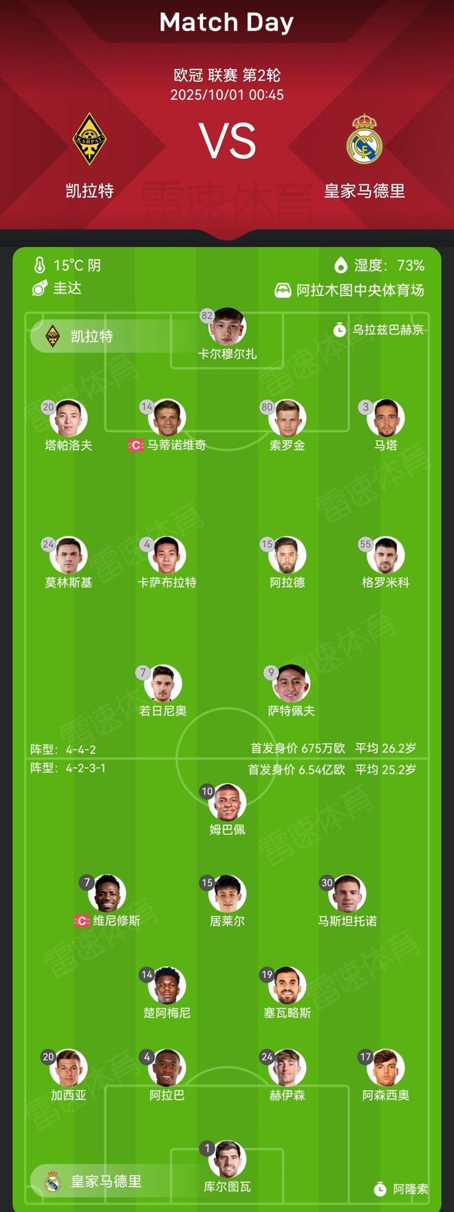 雷速体育10月1日讯 欧冠联赛阶段第2轮,皇家马德里远征哈萨克斯坦阿拉木图客场对阵凯拉特。赛前,两队首发阵容出炉。