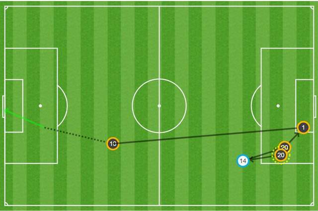 库尔图瓦不敢怠慢,抡起左脚大力踢向前场。这是一次平常无奇的传球(更像是解围),没有引发太多人的注意,甚至转播镜头都切走了。不过一转眼,姆巴佩就形成1v1的单刀,凭借超人的速度、爆发力,姆巴佩杀入禁区挑射破门!
