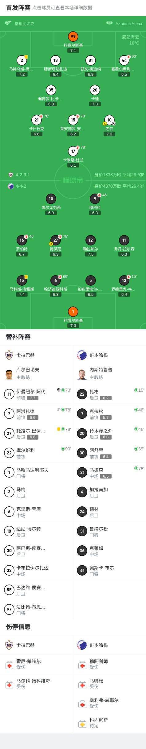 第28分钟,比卡尔奥射门中框,佐伯补射破门,卡拉巴赫1-0哥本哈根