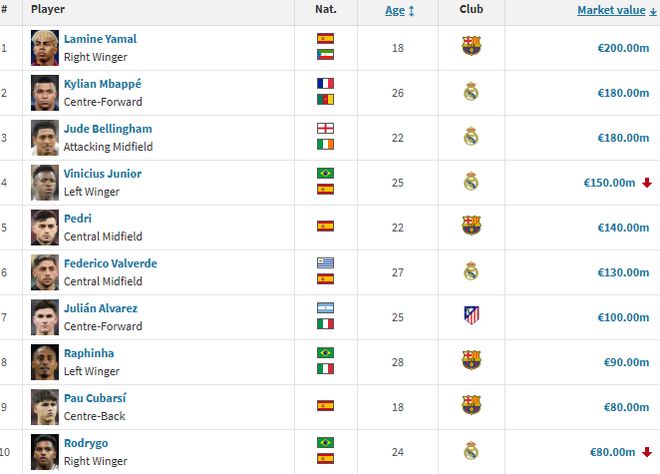 雷速体育10月2日讯 德转今日更新西甲球员身价排行,亚马尔2亿欧仍居首,姆巴佩、贝林分列二三位,维尼修斯跌至1.5亿欧。