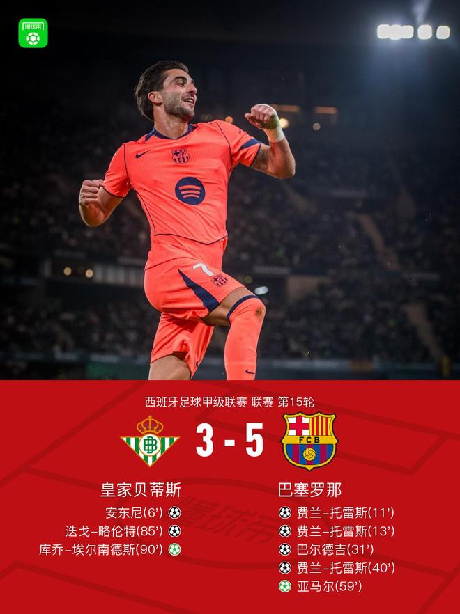 北京时间12月7日西班牙足球甲级联赛第15轮,皇家贝蒂斯主场对阵巴塞罗那。上半场,安东尼率先破门。随后,费兰双响帮助巴萨反超比分。佩德里传球,巴尔德吉劲射得分。佩德里助攻,费兰远射半场成功戴帽。下半场,红蓝军团获得点球机会,亚马尔主罚命中。比赛最后时刻,迭戈-略伦特和库乔为贝蒂斯扳回两城。全场比赛结束,巴萨5-3击败贝蒂斯,迎来西甲6连胜,继续占据榜首位置。