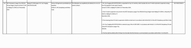 2. 其中一场禁赛在2025/26赛季亚足联冠军联赛第二阶段(小组赛)北京国安对阵麦克阿瑟FC的比赛中执行。