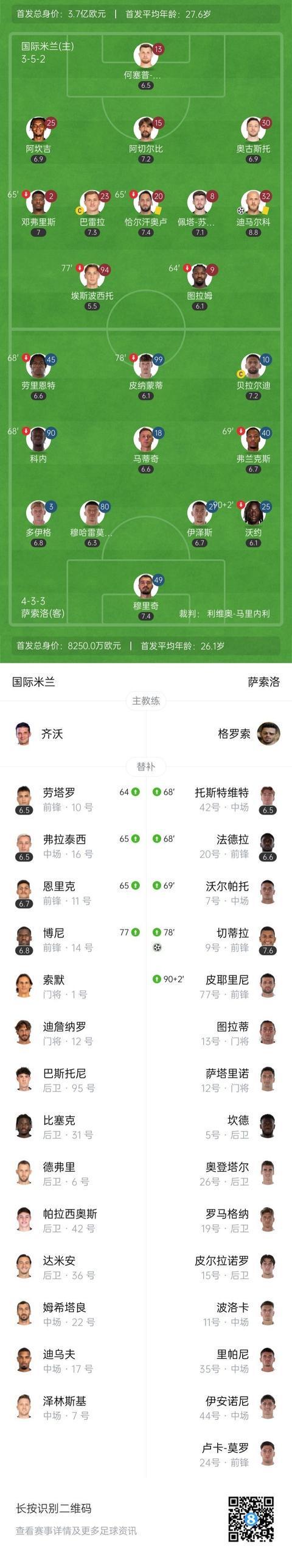 下半场伤停补时6分钟,全场比赛结束,最终国米2-1萨索洛。