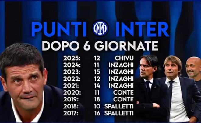 根据Sportitalia的统计,齐沃执教国米意甲前6轮的成绩不及斯帕莱蒂、孔蒂以及西蒙尼-因扎吉执教蓝黑军团时的同期数据。