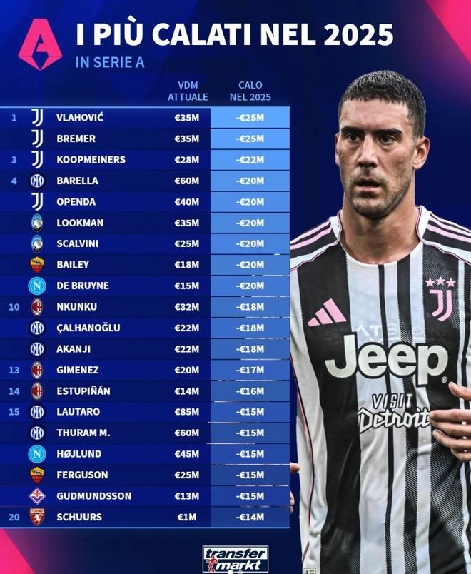 北京时间12月31日,德转列出了意甲2025年球员身价跌幅榜,尤文图斯包揽前三,弗拉霍维奇和布雷默下跌2500万欧元并列第一,库普梅纳斯下跌2200万欧元第三。