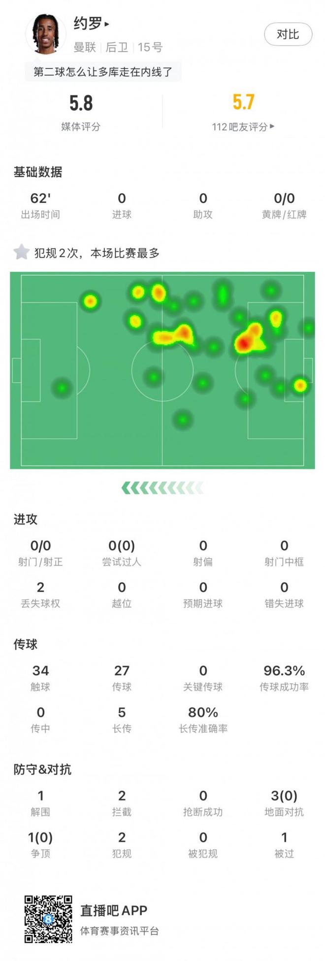 直播吧9月15日讯 英超第4轮曼市德比,曼联后卫约罗首发出战62分钟,球员本场数据如下: