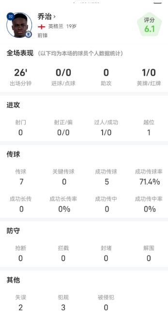 乔治在场上7次传球5次成功,传球成功率为71.4%。乔治在防守端没有任何的表现,他反倒是有着2次失误3次犯规,被出示1张黄牌,完全拖了球队的后腿。