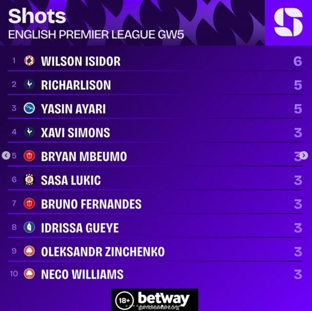 直播吧9月24日讯 英超第5轮战罢,squawkafootball列各项数据排行,桑德兰前锋伊西多是本轮射门次数最多的球员,共6次。