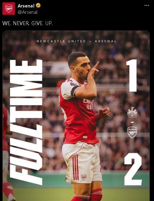 阿森纳社媒赛后激情发文:“我们永不放弃!”