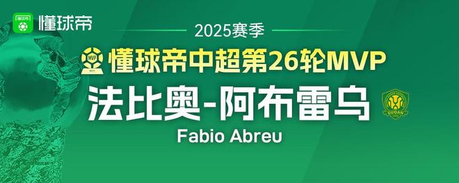大家好,欢迎来到懂球帝2025赛季中超MVP评选现场。中超第26轮MVP得主出炉,北京国安外援法比奥凭借对阵大连英博时上演帽子戏法的出色表现,以2.2%的微弱优势险胜莱昂纳多,当选本轮中超的MVP。这是法比奥在2023赛季第23轮、2025赛季第8轮后,第三次获得中超MVP。