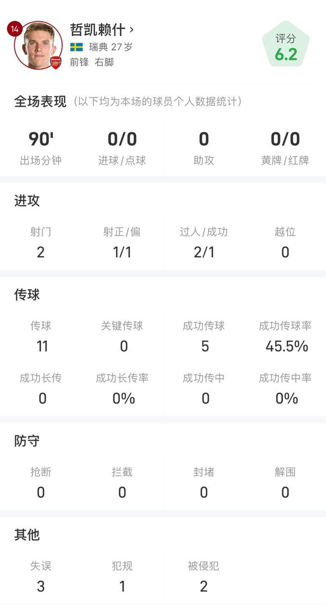 雷速体育10月5日讯 英超第7轮,阿森纳主场2比0击败西汉姆联。阿森纳前锋哲凯赖什首发踢满全场。