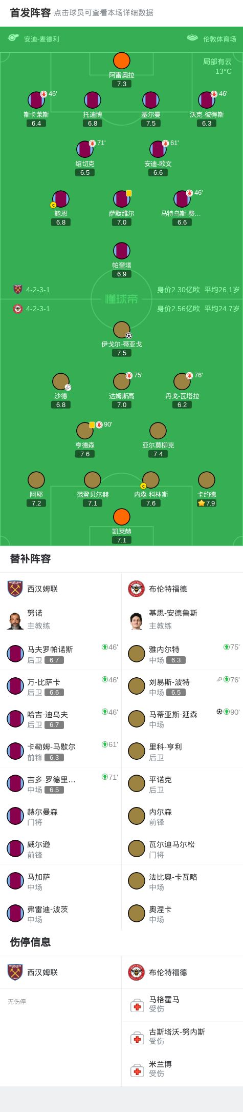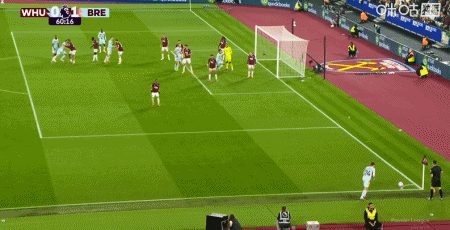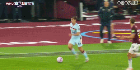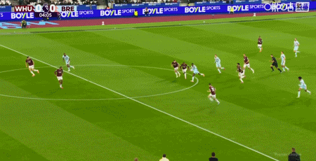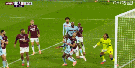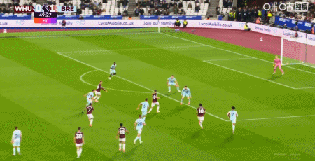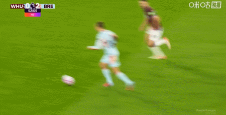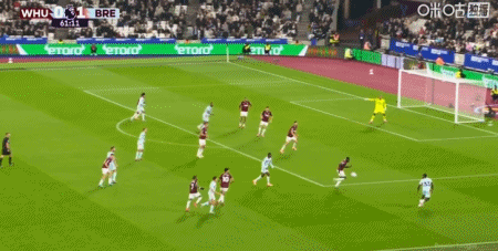 第43分钟,沙德助攻,蒂亚戈射门得分,布伦特福德1-0西汉姆联