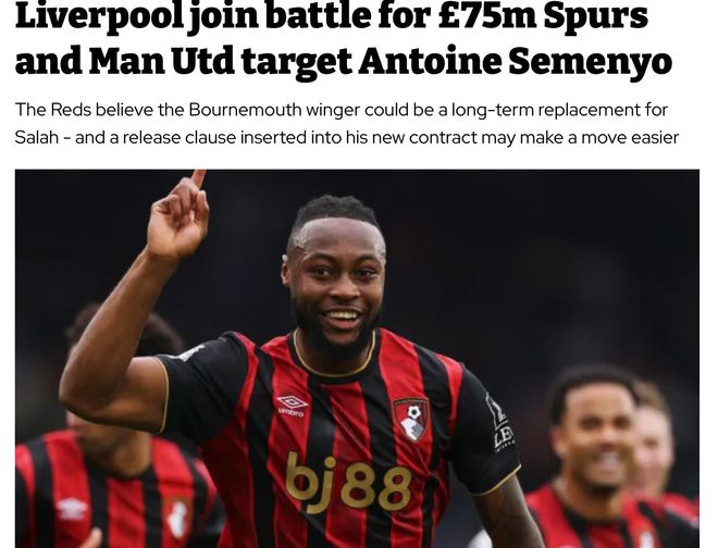或许是听到了球迷的心声,根据英国媒体《inews》的爆料,利物浦高层已经物色好了萨拉赫的替身,他就是效力于伯恩茅斯的攻击手塞门约。最快在今年的冬季转会窗,红军就将出手,引进这位英超现在最炙手可热的边路攻击手。