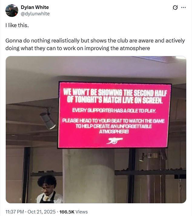 在对阵马竞的欧冠比赛中,酋长球场大厅内的电视上并没有播放下半场的比赛。屏幕上显示了一条提示信息:“我们不会在电视上直播今晚的下半场比赛。每位球迷都有自己的角色,请回到座位上观看比赛,助力营造令人难忘的赛场氛围。”
