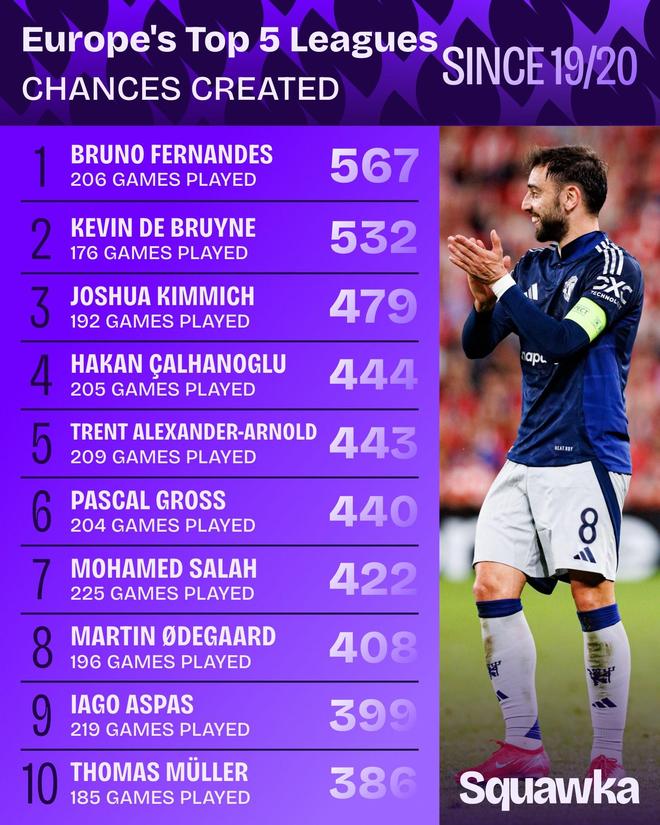 1、布鲁诺-费尔南德斯:206场比赛,创造567次机会