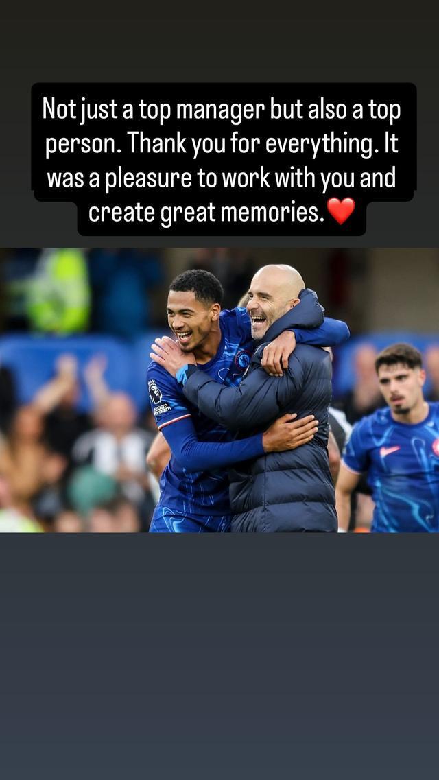 在马雷斯卡离开切尔西帅位后,科尔威尔在社交媒体告别马雷斯卡,这位切尔西后卫晒出了一张他和马雷斯卡拥抱的照片,并写道:“不仅是一位顶级的主教练,更是一位顶级的人。感谢你所做的一切。能与你共事、一起创造美好的回忆,是一种荣幸。❤️”