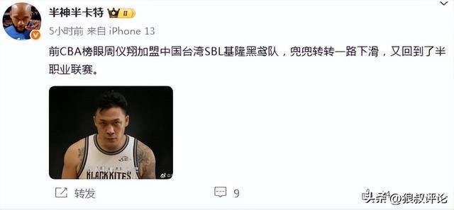 北京时间10月22日,根据媒体人“半神半卡特”报道,前CBA榜眼周仪翔加盟中国台湾SBL基隆黑鸢队,又回到了半职业联赛。