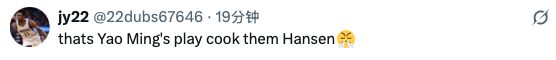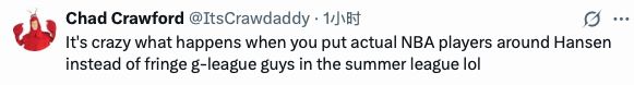“当你把真正的NBA球员放在杨瀚森身边,而不是夏季联赛里那些边缘的G联赛球员时,发生的一切太疯狂了哈哈。”
