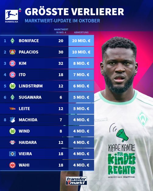 雷速体育10月14日讯 德国转会市场更新了德甲球员身价,并列出了更新后的德甲球员身价跌幅排行榜,目前租借加盟不莱梅的药厂中锋博尼法斯以2000万欧跌幅位列第一。