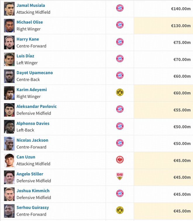 德国转会市场更新了最新一期德甲身价,穆西亚拉身价没有变更,仍以1.4亿欧居首。拜仁边锋奥利塞身价暴涨3000万欧,达到了1.3亿欧位居德甲第二位。