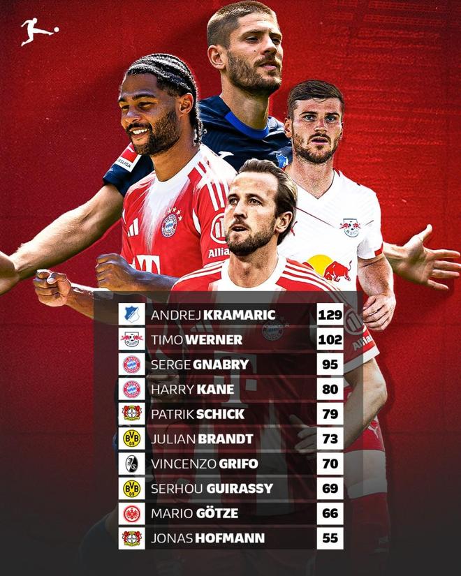 北京时间12月18日,德甲官方列出了现德甲进球数最多的10名球员,目前效力于霍芬海姆的克拉马里奇以129球排名第一,维尔纳102球第二,格纳布里95球第三,哈里-凯恩、希克、布兰特、吉拉西以及格策上榜。