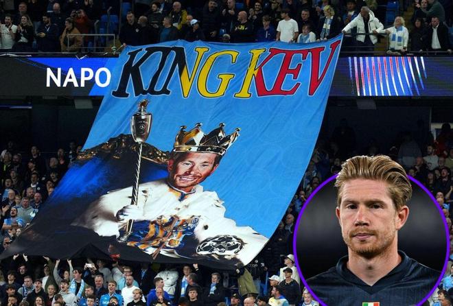 双方球员进场,德布劳内受到了曼城球迷疯狂的欢迎。看台上,球迷展示了他们精心准备的巨大tifo,上面写着“king kev(国王凯文)”、“一日为蓝,终生为蓝”。德布劳内看到后有些激动。