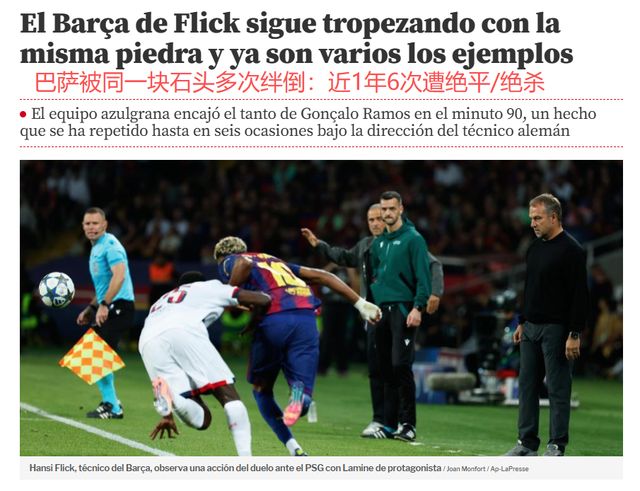 欧冠联赛阶段第2轮,巴萨主场1-2负于巴黎圣日耳曼,遭遇赛季首败。10月2日,《世界体育报》指出,巴萨在第90分钟丢球遭绝杀,这让主帅弗里克很不满。最近1年,巴萨已经6次被绝平或者绝杀。