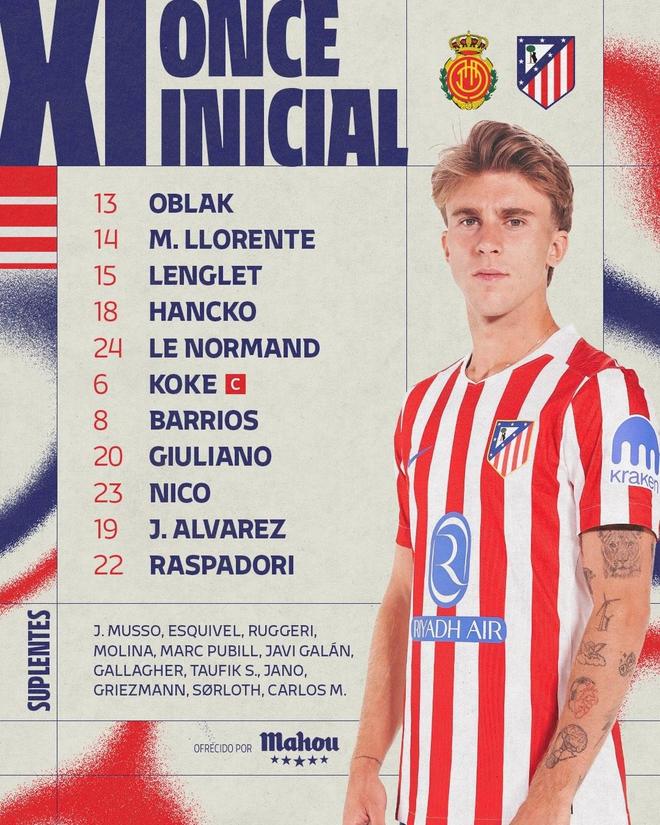 北京时间9月21日21:15,西甲第5轮,马竞客场挑战马略卡。赛前,马竞首发公布如下: