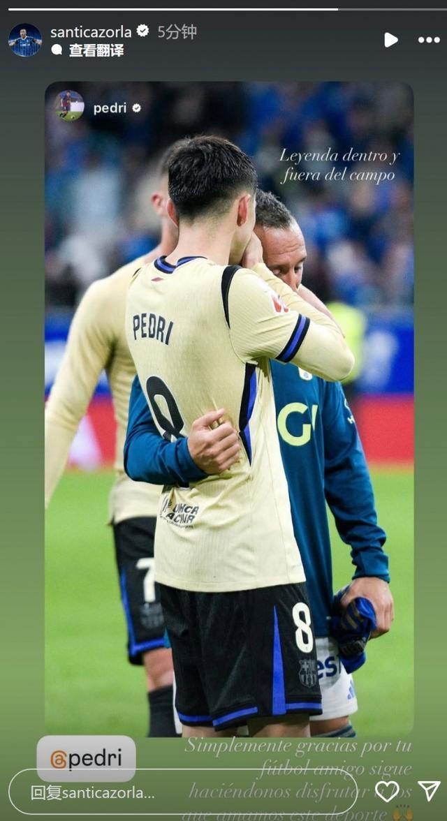 卡索拉转发佩德里的动态,写道:“感谢你的足球,朋友,让我们这些热爱这项运动的人继续享受吧!”