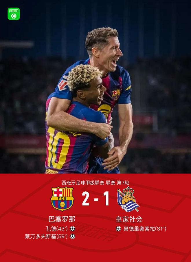 北京时间9月29日西班牙足球甲级联赛 联赛 第7轮,巴塞罗那主场对阵皇家社会。上半场,巴雷内切亚助攻,奥德里奥索拉率先破门。随后拉什福德开出角球,孔德头槌扳平比分。下半场,刚刚替补登场的亚马尔立马送出助攻,莱万帮助红蓝军团反超比分。全场比赛结束,巴萨2-1逆转击败皇家社会,成功登顶西甲联赛。