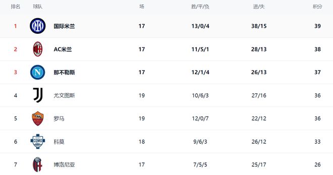 在积分榜上,国际米兰以39分继续领跑。AC米兰紧随其后,拿到38分。那不勒斯以37分排第3。尤文图斯和罗马都是36分,排名第4和第5名。争冠格局白热化,前5的球队最多只差3分。不过,尤文图斯和罗马踢的场次比较多,比前3的球队多踢了2场,他们要想冲击冠军还是比较困难。科莫这匹黑马在法布雷加斯的率领下战绩出色,总积分达到33分,排名第6。