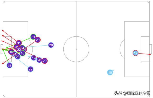 而这18次射门里,有10次攻门是中后场球员完成,其中禁区外远射达到7次,如图所示。