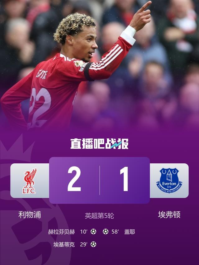 直播吧9月20日讯 北京时间9月20日19:30,2025-26赛季英超联赛第5轮迎来默西塞德德比,利物浦坐镇安菲尔德球场迎战埃弗顿。上半场萨拉赫助攻赫拉芬贝赫破门,埃基蒂克接到赫拉芬贝赫直塞再下一城,利物浦暂2-0埃弗顿;下半场盖耶扳回一球,最终利物浦2-1埃弗顿,开赛5连胜积15分,先赛一场6分优势领跑积分榜。