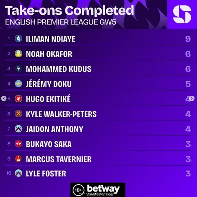 直播吧9月24日讯 英超第5轮战罢,squawkafootball列各项数据排行,埃弗顿边锋恩迪亚耶是完成过人最多的球员,共9次。