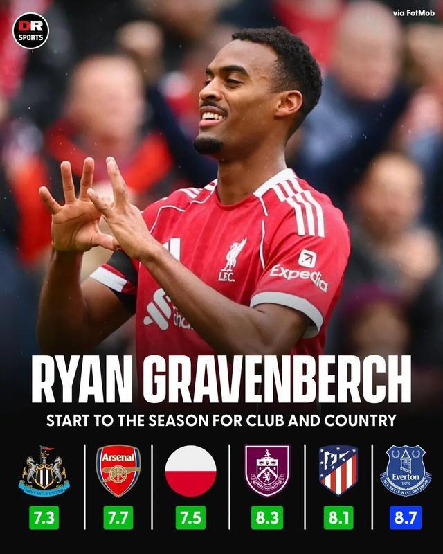 上赛季,赫拉芬贝赫作为利物浦的“六号位”后腰表现出色,尽管这仍是他的主要角色,但斯洛特在新赛季给了他更大的自由度,效果显著。虽然他的防守数据(抢断、解围和赢得球权)与上赛季几乎相同,但本赛季他的进攻数据得到了极致的开发。5次登场,贡献2球2助攻,位居利物浦中场球员之最。