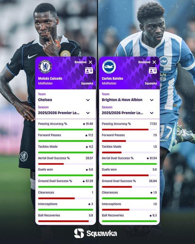 直播吧9月26日讯 北京时间明天晚上,切尔西将在英超第6轮比赛中主场对阵布莱顿。Squawka统计了凯塞多、巴莱巴本赛季的英超数据,并做出对比。