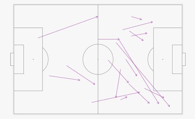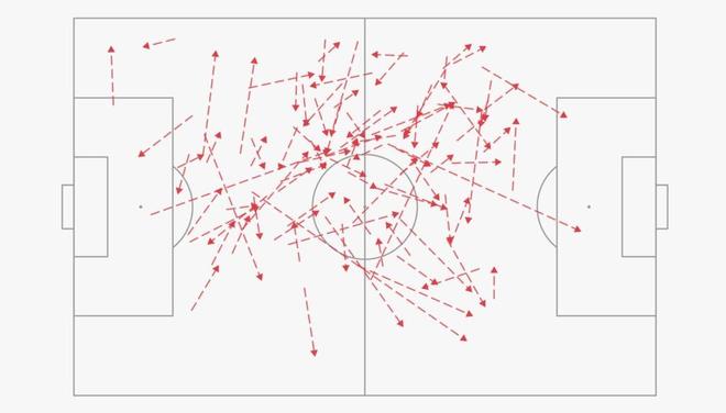 除了带球,他的传球同样具备撕裂防线的能力。本赛季,他已完成52次“穿透防线传球”,在所有英超中场中排名第三。对阵纽卡斯尔一役,他送出17次此类传球,其中4次甚至穿透两道防线——这样的表现在本赛季尚属首次。
