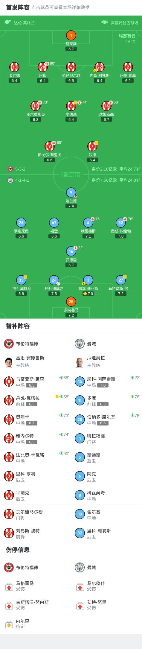 北京时间10月5日23:30,英超第7轮继续进行,曼城作客布伦特福德社区球场挑战布伦特福德,本场主裁判为达伦-英格兰。上半场,哈兰德凭借个人能力破门,罗德里伤退。下半场,伊戈尔-蒂亚戈单刀打门被多纳鲁马化解。最终,曼城1-0客胜布伦特福德。