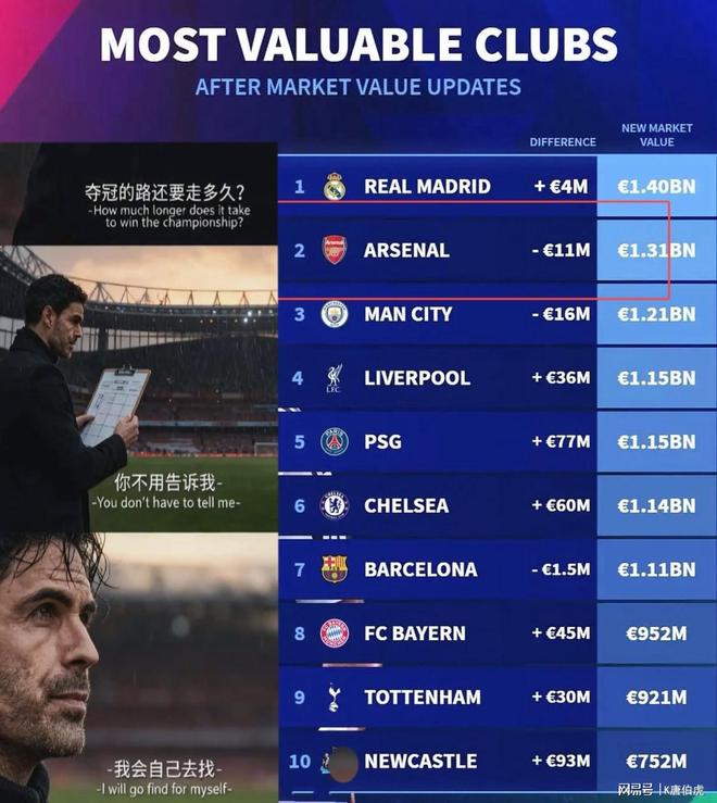 在最新发布的世界俱乐部身价排行榜单中,阿森纳排在了第二名,仅次于皇马。也因此不得不说压力已经全部给到了阿尔特塔,本赛季再不夺冠,那么相信他自己也都无法接受继续待在酋长球场了!