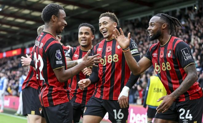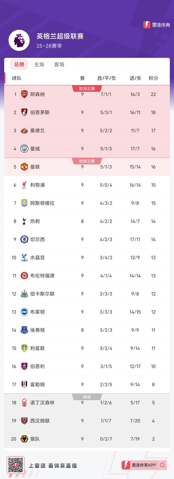 雷速体育10月27日讯 新赛季英超联赛来到第9轮,阿森纳继续领跑积分榜,但在积分榜紧追阿森纳的却不是利物浦、曼城、切尔西等豪门,而是伯恩茅斯、桑德兰。