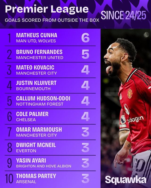 北京时间10月26日,知名数据平台Squawka列出了自上赛季以来,在英超联赛中禁区外进球最多的球员。库尼亚6球领跑榜单,B费5球位居第二,科瓦契奇4球第三。