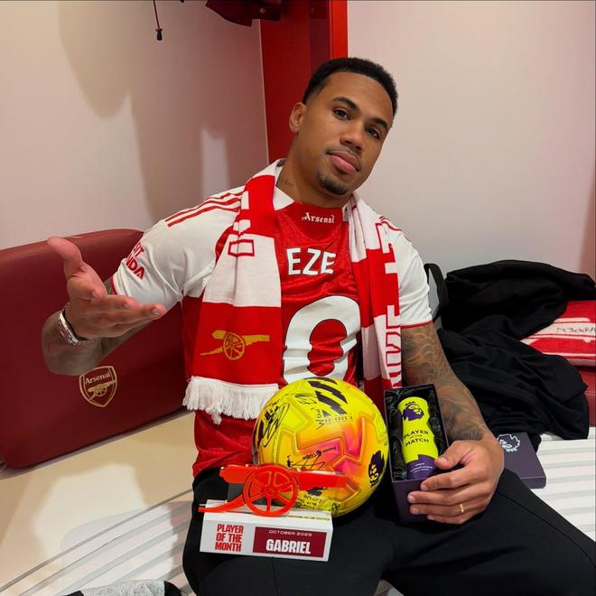 在阿森纳此役4-1大胜热刺后,因伤无法上场的加布里埃尔在社交媒体晒出他在更衣室反穿埃泽球衣的照片,照片中加布里埃尔腿上放着全场最佳球员奖杯和比赛用球(归属于埃泽)以及阿森纳10月最佳球员奖杯,此外,加布里埃尔还在图片中标记了里沙利松。