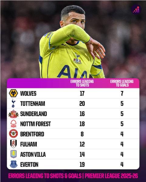 根据统计,到目前为止,在本赛季的英超联赛中,热刺已经出现了5次导致对方进球的失误,仅次于狼队的7次。热刺还在导致对方射门的失误次数方面位居联赛首位,共有20次。