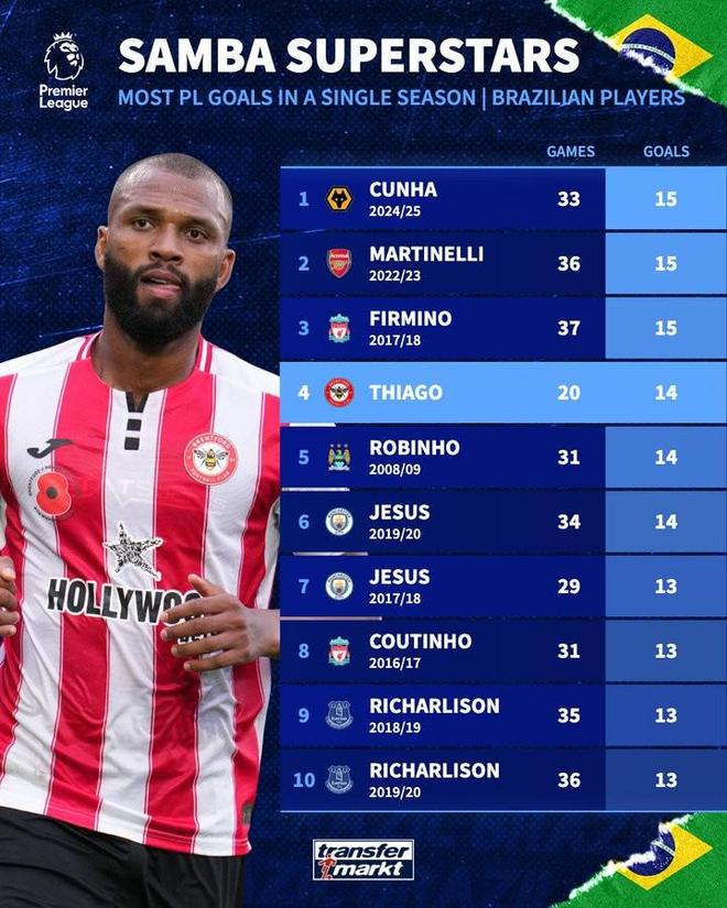 当地时间1月4日,英超第20轮,布伦特福德客场对阵埃弗顿。布伦特福德前锋伊戈尔-蒂亚戈上演帽子戏法,帮助球队取胜的同时也将自己本赛季的英超进球数提升到14粒,位列射手榜第二。