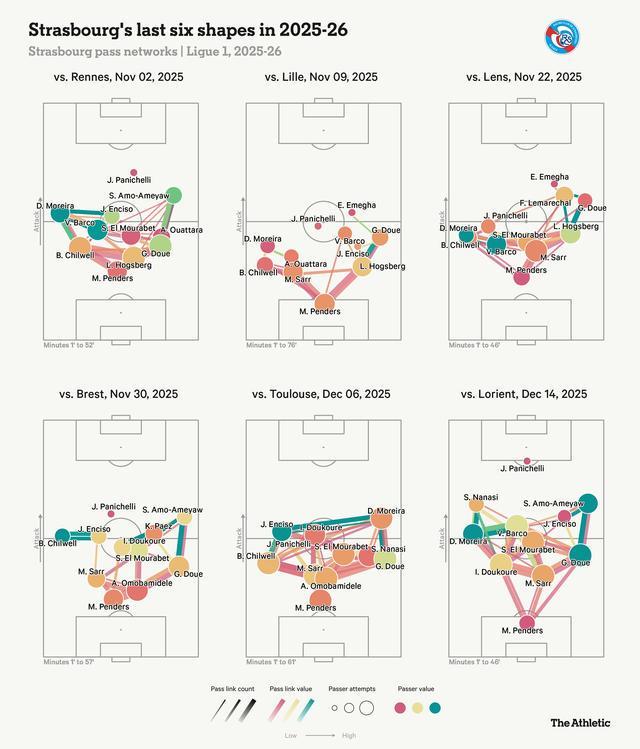 这一点清晰地体现在罗塞尼尔2024年上任以来的更广泛趋势中,其前任帕特里克-维埃拉执教时期的高位夺回球权率较低。在上赛季末趋于平稳后,本赛季斯特拉斯堡在进攻三区夺回球权的次数呈上升趋势——在2025-26赛季的法甲中,只有巴黎圣日耳曼的高位夺回球权后形成射门的次数(5次)比他们更多。